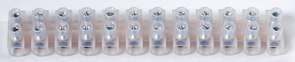 Standard terminal block with 12 brass connectors 6mm with zinc plated steel screws. For voltage up to 380v- 5AMP and temperature up to 80°C