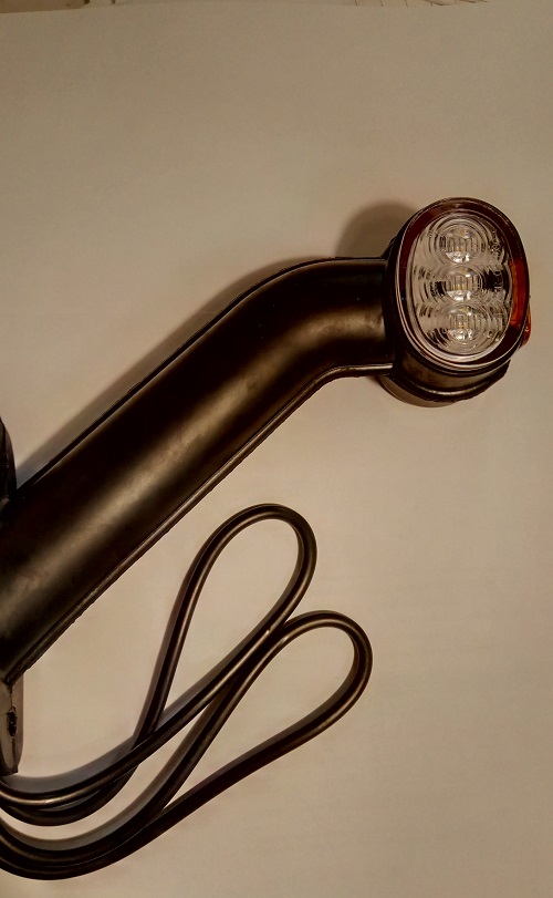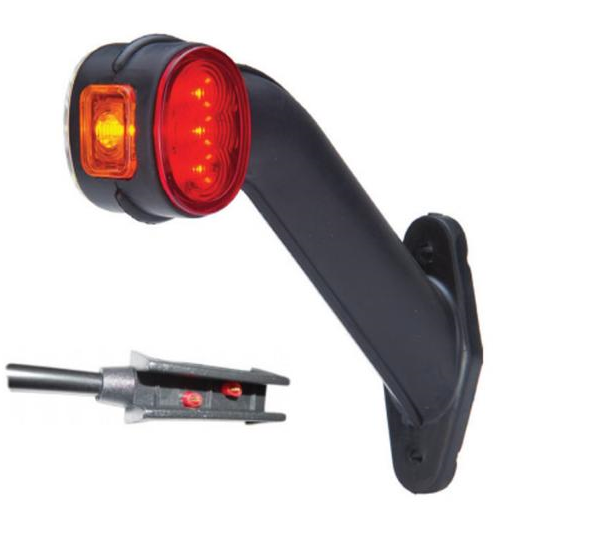 Led marker integrated into standard length very flexible rubber holder. With white+red+amber LED illumination. Fits left side. Suitablle for large trucks and trailers. Cable exit 1.5m+CLICK IN.