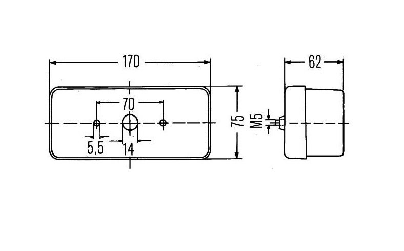 Front combination lamp R5W tail P21W indicator,R5W+smernik P21W, 12V, 170x75mm, bolt to bolt 70mm, cable entry, LH=RH, Hella