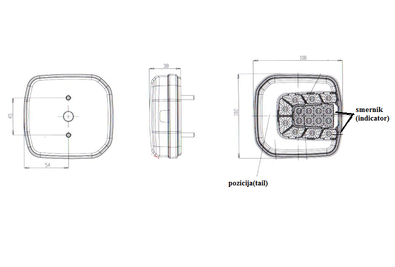 LED front combinaton lamp U, tail neon+LED indicator, 12-24v, 102x108mm, kabel 2m, L=R, w