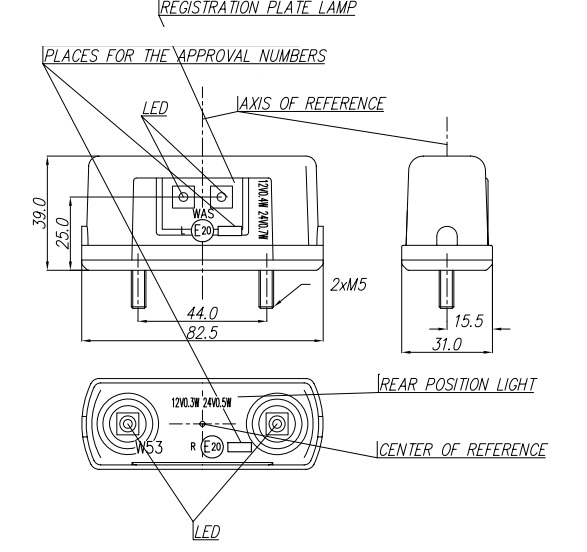 Number plate light+RED position, LED 12-24v, bolt distance 45mm, cable 1m+Click IN 24V, W