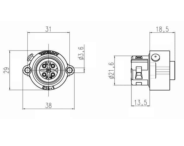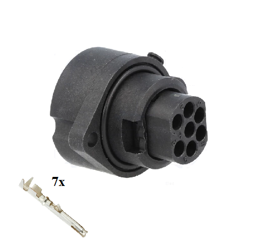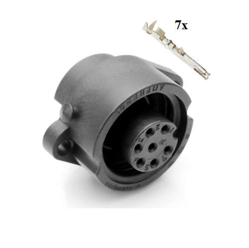 Funkcije: 7 polni ženski vgradni okrogel konektor s priloženimi kontakti. Pritrditev z dvemi vijaki.