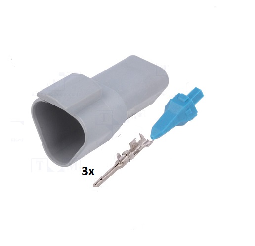 3 polni moški vodotesni konektor tipa Deutsch s kontakti (3x) in zaklepom (1x).
