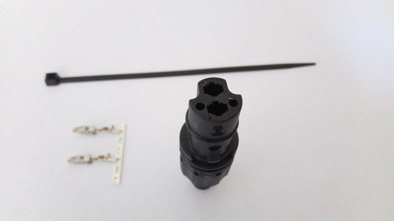 Kontakt: za stiskanje, za žice preseka 0.5....1.5mm2 Vezava: 1: masa, 2: napajanje(+). Priporočljiv kabel 2x 1mm2