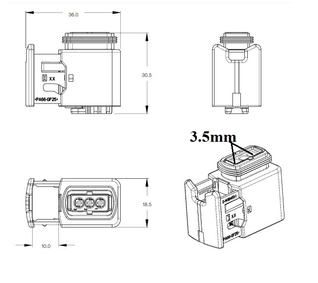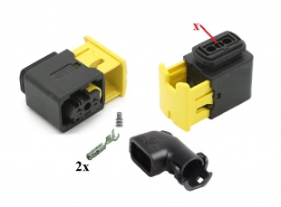 2 polni vodoodporen ženski konektor z majhnimi kontakti in tesnili ter eno kotno uvodnico. Posebnost je, da je sredinski vhod zaprt. Primeren za univerzalno uporabo, priklop komponent v vozilih.