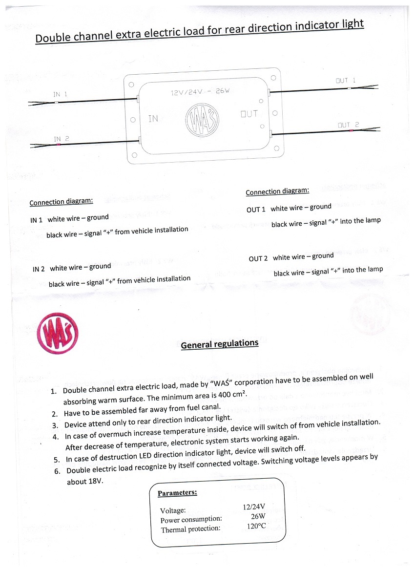 Kontrolna enota za dva smernika z vgrajenimi upori je namenjena za odpravo hitrega delovanja led smernikov, ki se lahko zaradi manjše porabe pojavi ob zamenjavi luči na žarnico z led tehnologijo. Enota ima vodoodporno kovinsko ohišje in jo je potrebno montirati proč od potencialno vnetljivih materialov in tekočin, ker se lahko močno segreje. Sama prepozna ali je vhodna napetost 12 ali 24v.