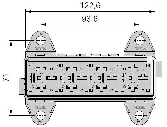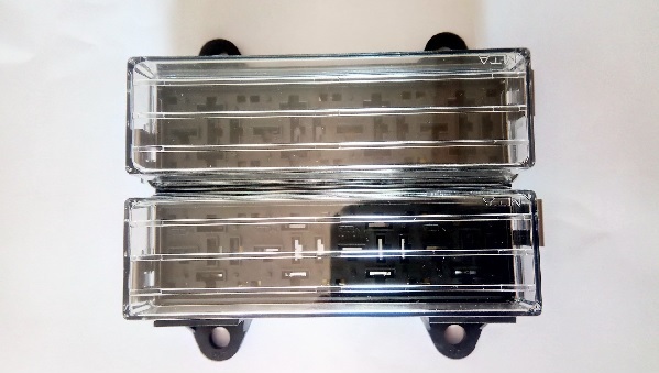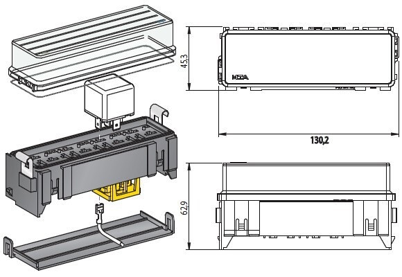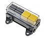 Modularna zasnova nam omogoča vzporedno montažo dveh ali več skupaj. Možno tudi z nosilcem istega tipa za 16 standard varovalk: (https://www.gepard.si/trgovina/kabli-in-pripomocki-za-vezavo/varovalke/nosilci-varovalk/nosilec-varovalk-16x-standard-19mm-ato-max-225a-32v-135x45mm-m-slo.html)