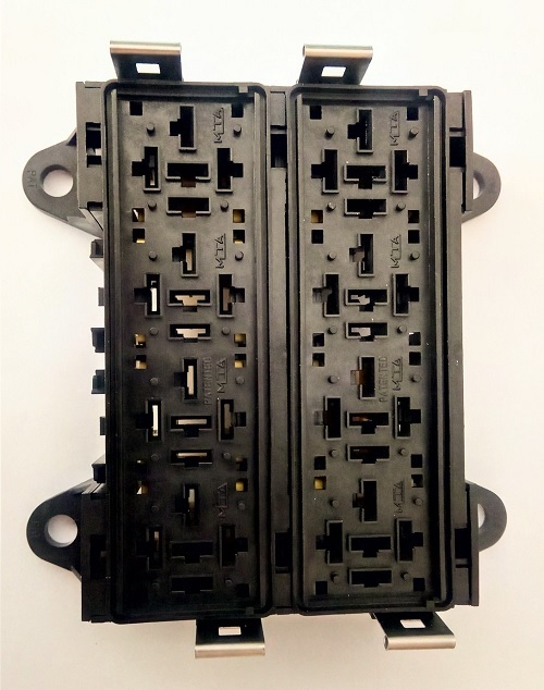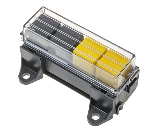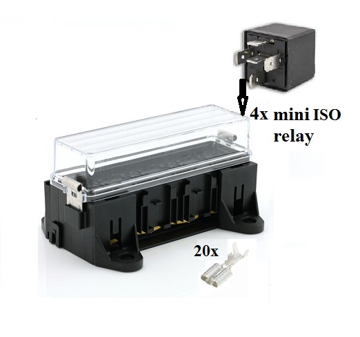 Nosilec za 4 standardne avto releje (ISO MINI) dimenzij 25x25mm s petimi ali štirimi kontakti 6.3mm.