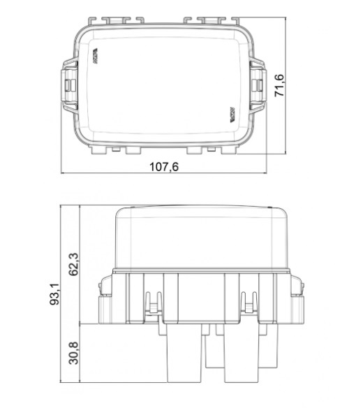 Mere dxšxv: 108x42x62mm, z nosilci za pritrditev: 108x115x62.