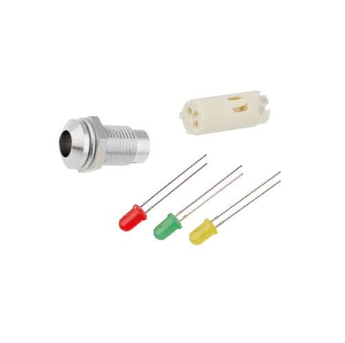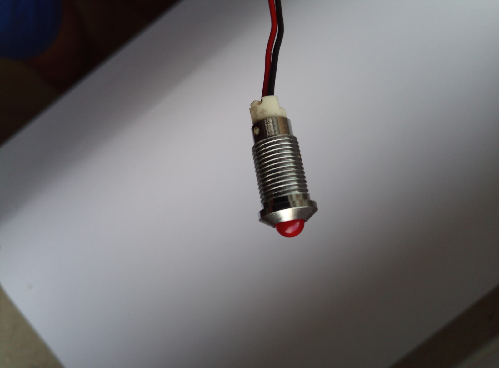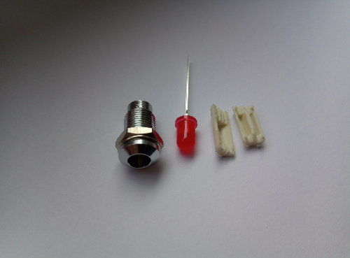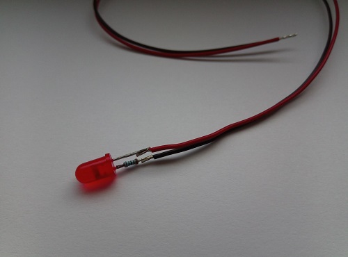 Kontrolno lučko je potrebno sestaviti( odrezati led diodo na dolžino 8-9mm in spajkati žice poljubne dolžine). Lahko uporabimo različne led diode (barve, napetosti), dodamo ustrezen upor(primer na sliki) in uporabljamo tudi na 24v napetosti.