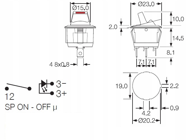 Majhno vgradno stikalo OFF-ON z rdečo osvetlitvijo