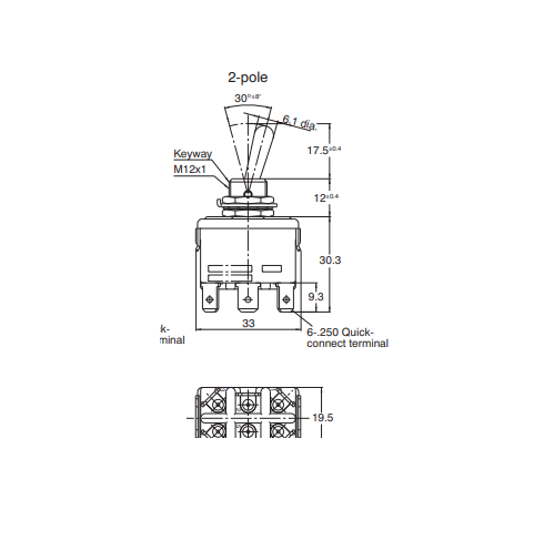 Stikalo ON-OFF-(ON), 15A 30V DC, fi 12,5mm, povratek 1x, kabel čevelj 6.3mm 6x, JAPAN