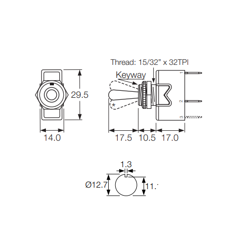 Stikalo (ON)-OFF-(ON), 16A 250V, fi 12,7mm, povratek 2x, kabel čevelj 6.3mm 3x