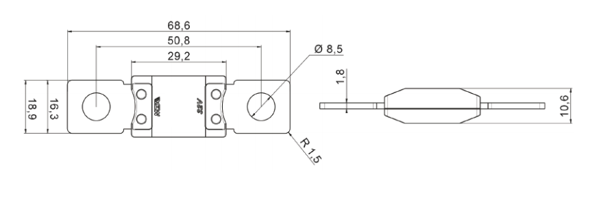 Varovalka MEGAVAL 100A-rumena, luknja M8- fi 8.5mm, dolžina 68.6mm, M