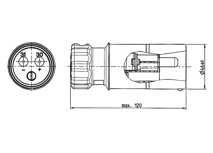 Dvopolni aluminjast vtikač BREZ integriranega varnostnega navoja je primeren za univerzalno uporabo. Ustrezen za priklop na dvopolno vtičnico vojaške izvedbe iz ponudbe(