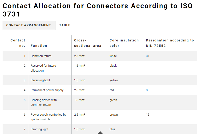Vtikač ima 6 moških kontaktov in enega ženskega, ki je nekoliko daljši in debelejši. Vezava po standardu DIN/ISO 3731-shema na sliki.