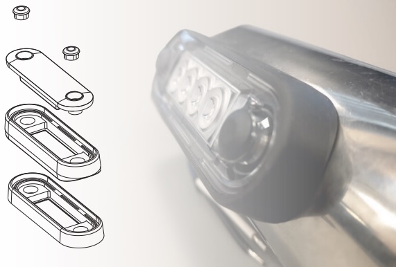 Dve priloženi gumi tesnili omogočajo horizontalo ali vertikalno montažo na ravno površino (npr. prednja maska) ali okroglo povšino (npr. prednja cevna zaščita).