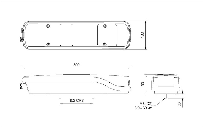 Mere: dolžina x višina x globina: 500x130x90mm, razmak med vijaki M8: 152mm
