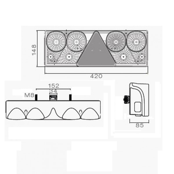 Mere: dolžina x višina x globina: cca 420x148x85mm, razmak med vijaki M8: 152mm