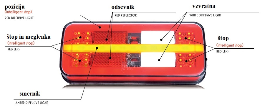 Moč: 12/24v: smernik (4.3/3.9w), pozicija (1.9/4.4w), štop (3.5/4.9w), meglenka (1.65/.2.2w), vzvratna (3.4/4w)