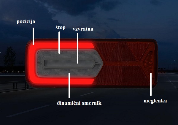 Funkcije: LED pozicija, LED štop, LED smernik s kontrolno enoto, LED meglenka, LED vzvratna, odsevni trikotnik