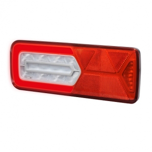 Zadnja LEVA LED luč z NEONSKO pozicijo in dinamičnim smernikom s kontrolno enoto. Primerna za večje tovorne prikolice Npr. Schmitz, Tabarrini.... in kot zamenjava za starejšo izvedbo tega modela luči (pozicija z vidnimi led diodami) in aspock Europoint II schmitz izvedbe na žarnice.