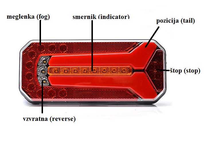 Funkcije: LED pozicija, LED štop, LED smernik, LED vzvratna, LED meglenka